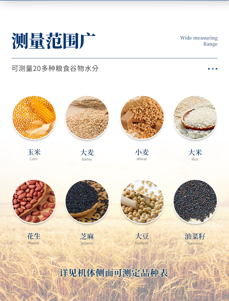 測量范圍:可測量谷類、玉米、東北玉米、大麥、小麥、白小麥、大米、豆粕、花生仁、菜粕、高粱、黑芝麻、棉籽、棉粕、秈谷、大豆、油菜籽、飼料、蔬菜種子等非金屬顆粒狀物質。
